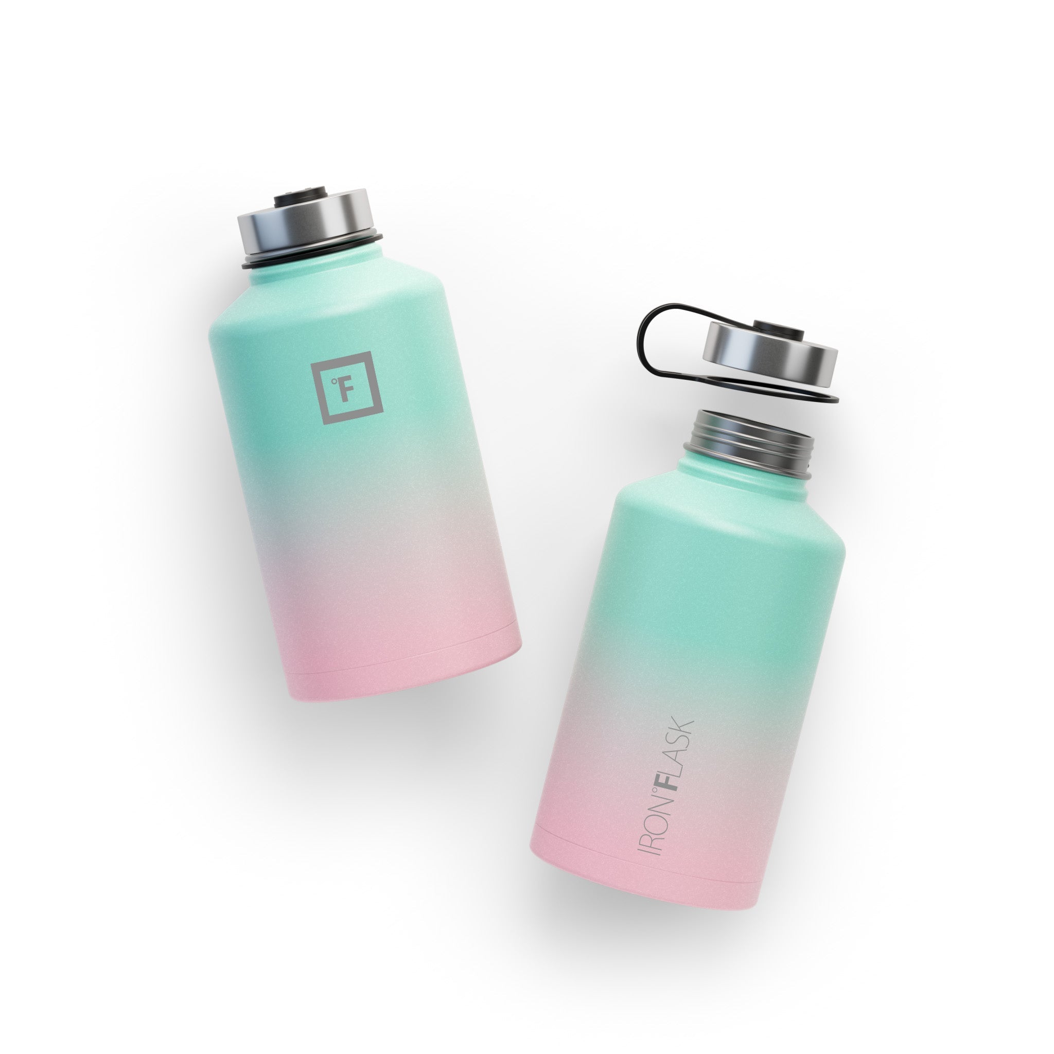 Iron Flask Wide Mouth Bottle with Spout Lid, Bubble Gum, 64oz/1900ml. The Iron Flask 64 oz Wide Mouth Water Bottle With Spout Lid is the perfect heavy duty companion for running around town, running at the gym, or running the world at the office. With our broad array of colors, you can rock a bottle that reflects your personal style, while the double-walled, vacuum-insulated stainless steel keeps your drinks cold for 24 hours and hot for 12 hours with no sweat. We included a flip lid and a stainless steel screw-on lid apart from the straw lid, so you can be the master of your drinking ways.