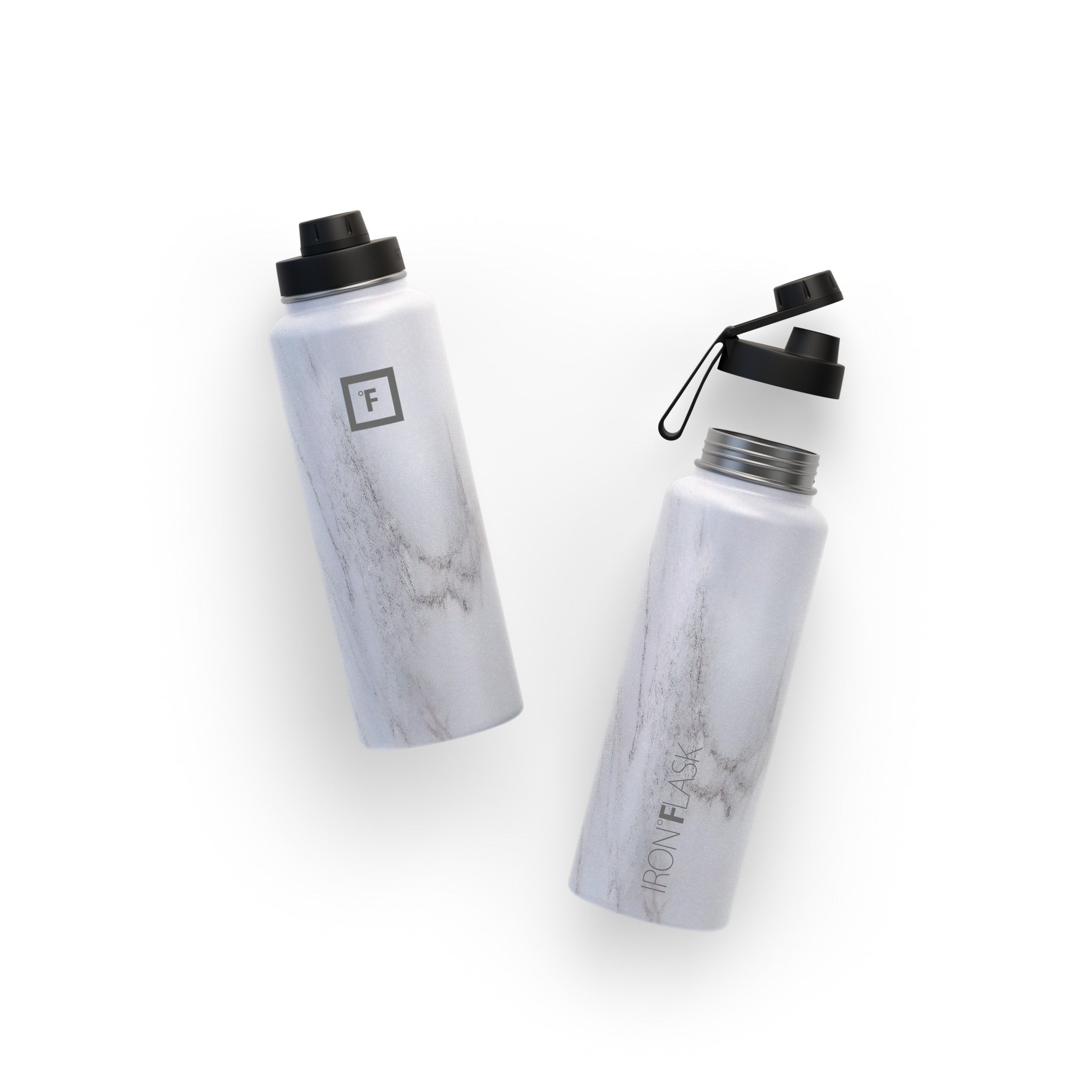 Iron Flask Wide Mouth Bottle with Spout Lid, Carrara Marble, 40oz/1200ml. The Iron Flask 40 oz Wide Mouth Water Bottle With Spout Lid is the perfect lightweight companion for running around town, running at the gym, or running the world at the office. With our broad array of colors, you can rock a bottle that reflects your personal style, while the double-walled, vacuum-insulated stainless steel keeps your drinks cold for 24 hours and hot for 12 hours with no sweat. We included a flip lid and a stainless steel screw-on lid apart from the straw lid, so you can be the master of your drinking ways.